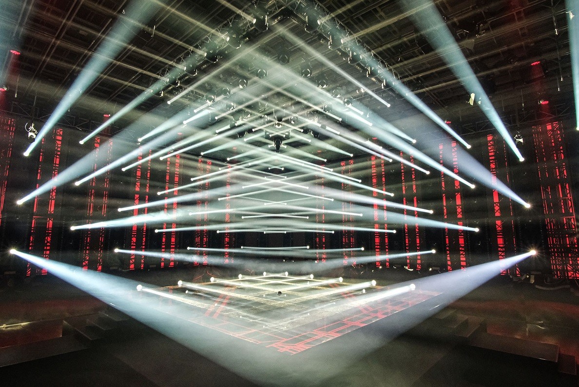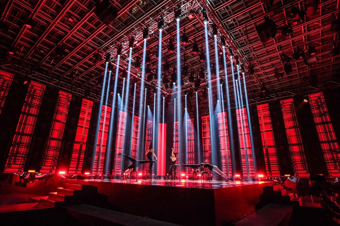 Behind this were two “upstage” walls created from LED strips and set in a V-shape aligning with the angle of the sides of the diagonal stage, and with the audience seated all around. Above the stage were two box trusses, one inside the other. The outer one was populated with the 24 Pointes to give a cage effect. The inside square truss was also rigged with beam lights for a tighter cage, and Birsa created some effects flipping back and forth between the different cage looks. “I wanted this very precise, clean and well-defined overall look”, he explains, adding that he aimed to produce unique looks and settings for the twelve competitors and five guest artists.