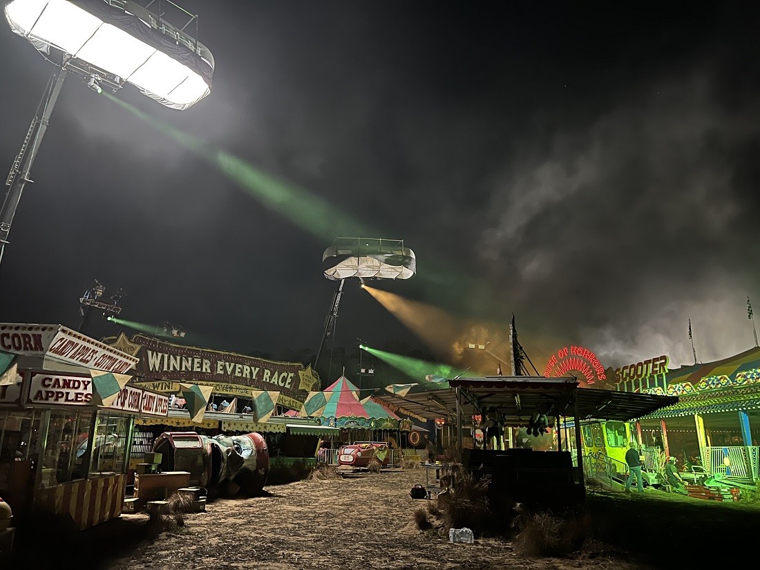 Androvich used the Proteus Maximus LED framing profile fixtures to highlight the action in the film’s “Happyland” amusement park scenes, often from condor positions. Indoors, the Fuze Max Profile fixtures were mounted atop utility poles, lifts, or set rigs and used for everything from a projector effect to simulating daylight. Androvich provided the Fuze Max Profiles himself, which he purchased via Kinetic Lighting, with the Proteus Maximus supplied by LightScape. He also integrated several Netron EN12 nodes, which he owns, into the lighting network to ensure reliable data control.