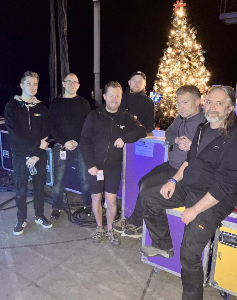 Group of six, with Christmas tree (left to right): Paul Bird (LX Tech), Jamie Catt (Kinesys Tech, Op), Jordan Lightfoot (LX Tech), Jake Rodway (LX Tech), Frank Kelly (LX Crew Chief), Mark Wheatley (LX Tech).