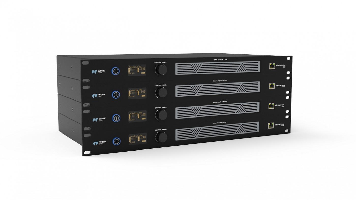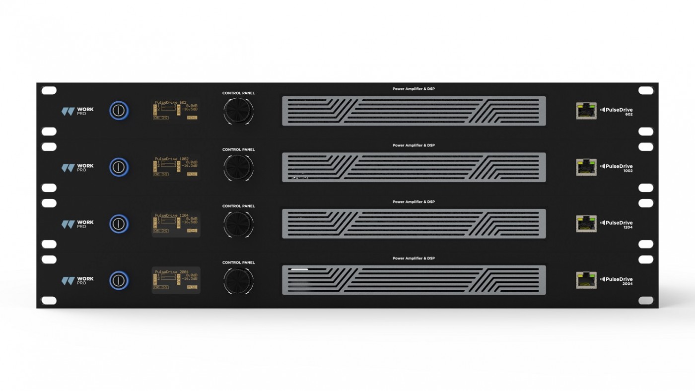 Work Pro Audio, the installation and pro audio division of Equipson, has launched the PulseDrive Series, a new range of DSP (digital signal processing) amplifiers consisting of four models in a compact, portable format: the PulseDrive 602 (two 300 W channels), the PulseDrive 1002 (two 500 W channels), the PulseDrive 1204 (four 300 W channels) and the PulseDrive 2004 (four 500 W channels).