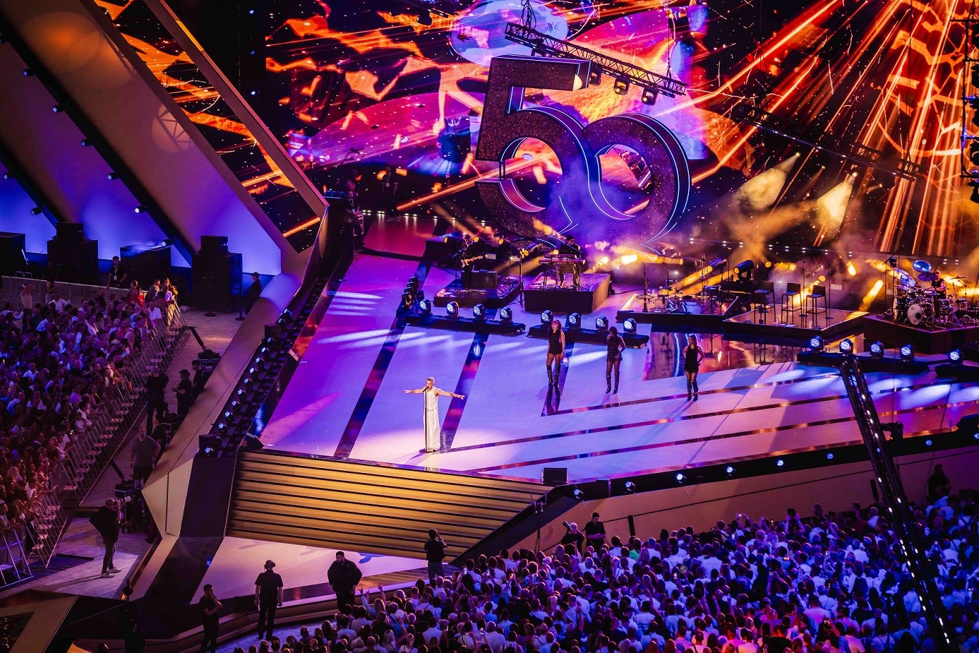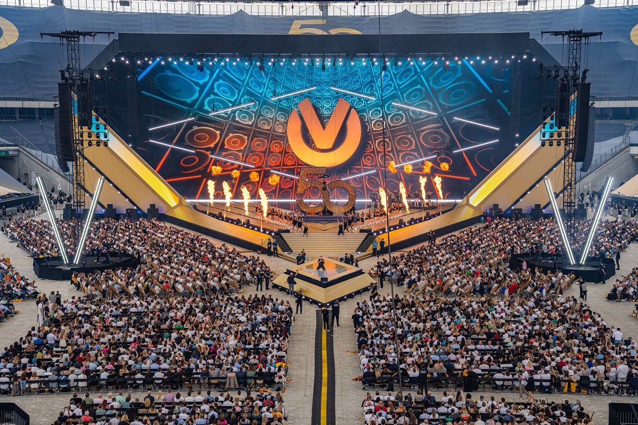 Für die Medientechnik zeichnete die Hibino Deutschland GmbH verantwortlich - von gemeinschaftlicher Planung mit der Experience-Production-Agentur Derse Germany GmbH über den Aufbau bis zum Live-Betrieb der LED- und Medienservertechnik. Herzstück war eine 20 x 50 Meter große Haupt-LED-Wand mit ROE-Black-Chip-Technologie, 8K-Prozessoren und einer Auflösung von 8.400 x 3.192 Pixeln. Zusätzlich kamen 170 Quadratmeter weitere LED-Flächen sowie ein hochauflösender LED-Boden zum Einsatz. Zur Integration in das Stadionkonzept nutzte Hibino außerdem bestehende LED-Systeme wie Rang-LEDs und den zentralen LED-Würfel. Weitere LED-Elemente wurden in die Bühnengestaltung eingebunden.
