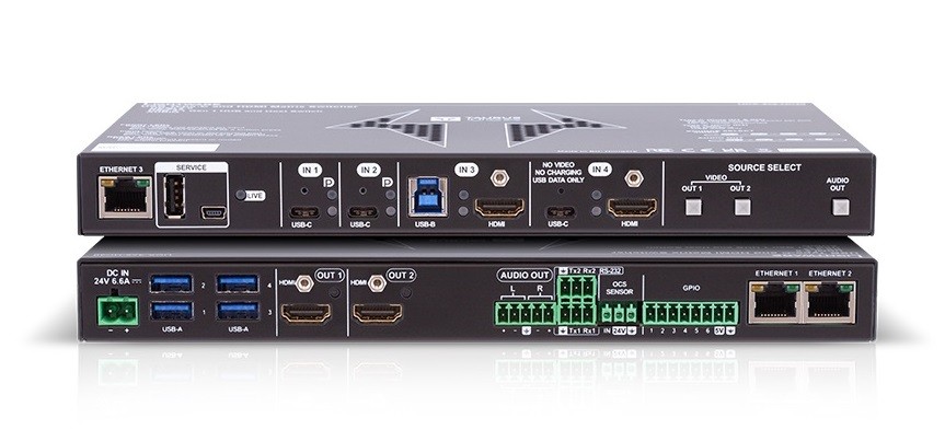The UCX-4x3-TPX-TX20 and UCX-3X3-TPX-RX20 transmitter and receiver pair allows multiple HDMI and USB host connections directly at the display’s side - such as a room PC, wireless presentation system, webcam, or speakerphone - while still supporting long-distance signal transmission over a single CAT6 cable.