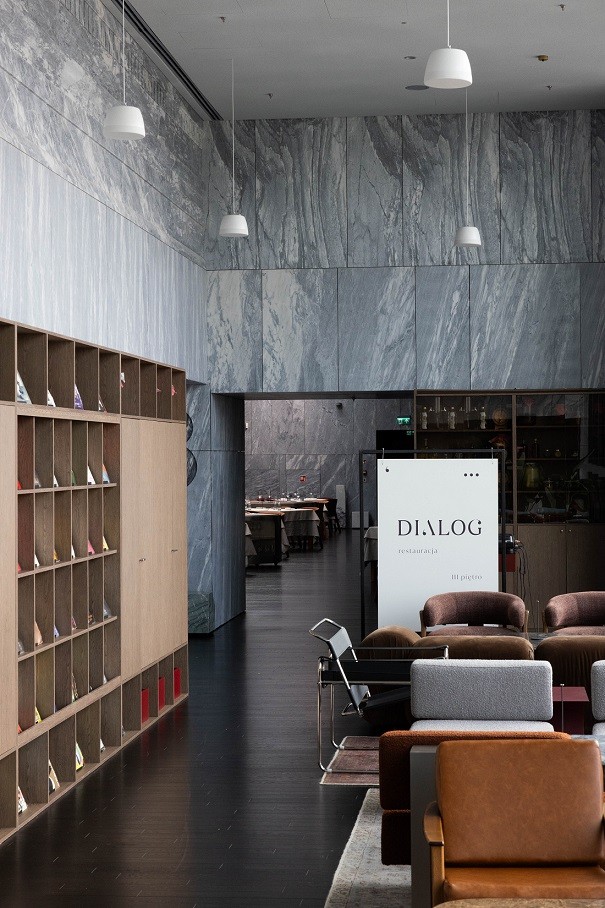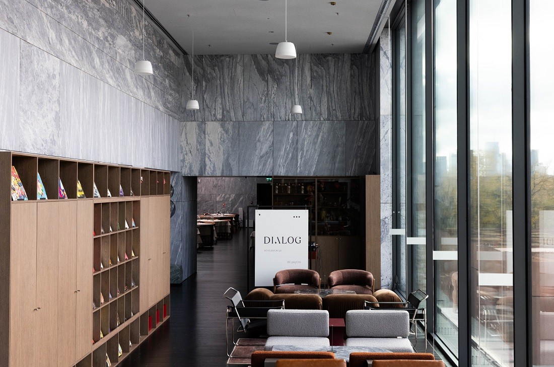 One standout project is the Polish History Museum in Warsaw, a monumental building covering 45,000 square metres. Within its marble architecture, the Dialog restaurant mirrors the building’s bold design language, with interiors heavily clad in stone slabs.