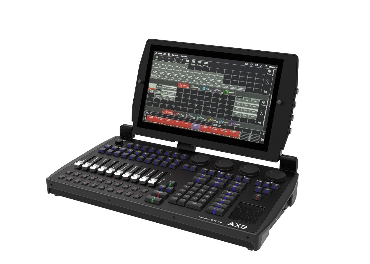ADJ introduces the AX2, a compact, portable and fully integrated DMX control solution built around the command-line-driven Onyx platform from Obsidian Control Systems. It features an integrated touchscreen, physical controls, a powerful media engine (Dylos), and up to 32 universes of output.