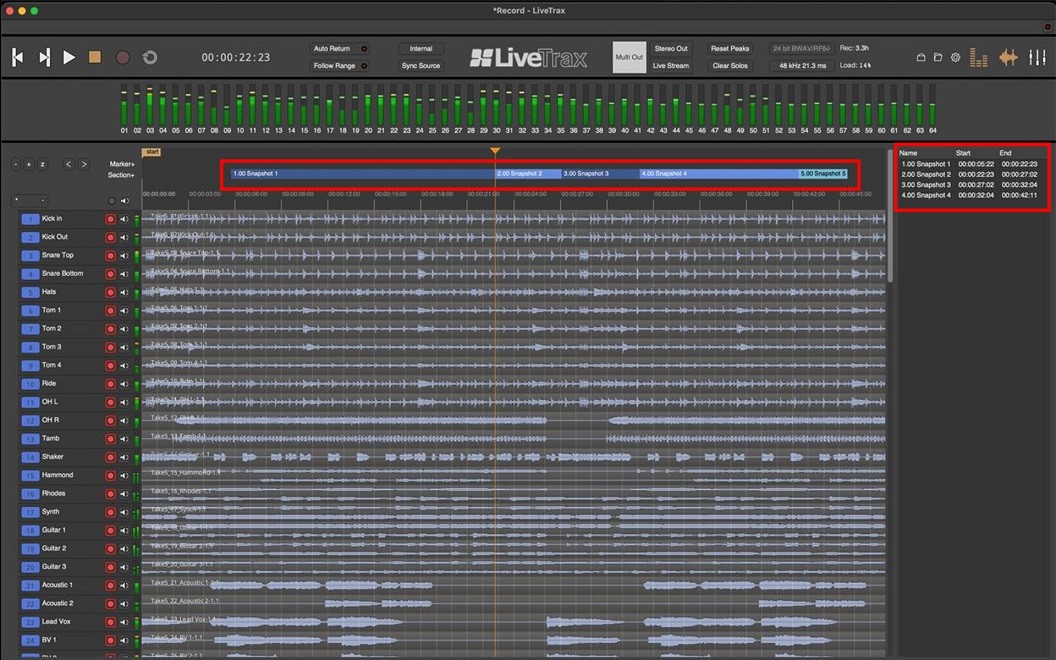 Harrison provides innovative software solutions for the Live and Studio market. Alongside the launch of the new LiveTrax 3 software, V22 provides a new integration creating a Recording and Virtual Soundcheck system. When fully integrated, channel names from the session can be pulled into the LiveTrax session and be updated at any time. Functions for controlling LiveTrax, such as record and play, are now available from the console directly, and whenever a snapshot is fired, a corresponding section with the same name is automatically inserted into the LiveTrax project, if this setting is enabled. When playing back into the console from LiveTrax, if a snapshot is fired, the play head automatically moves to the corresponding section and begins to play from there.