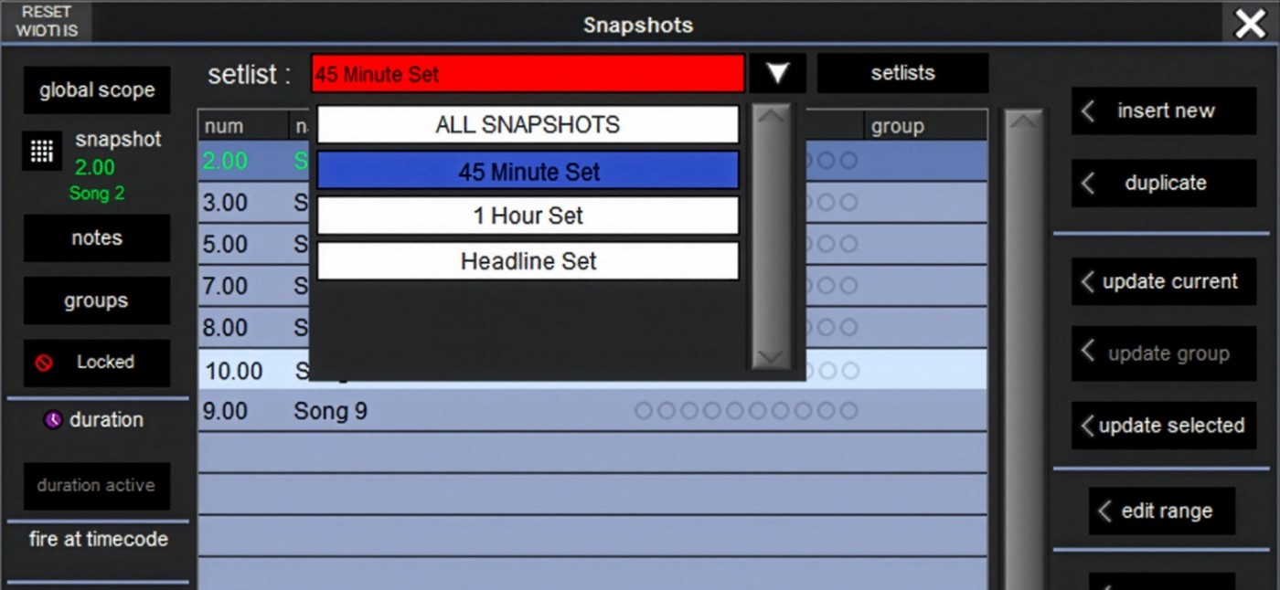 With V22, Setlists have also been added to the Snapshots panel. This feature is designed to quickly build up custom shows from a library of different snapshots. By default, the All Snapshots list includes all snapshots in a session. Further setlists can then be created and snapshots added and removed from these. The console will then only recall snapshots in the current setlist. Snapshots in setlists can be in a different order to the All Snapshots list and the console will fire through them in this custom order. As a real-world example, during festival season, an act may change the length of its set each day, prompting the audio engineer to create specific 45-minute, hour-long, and headlining setlists for easy show selection.