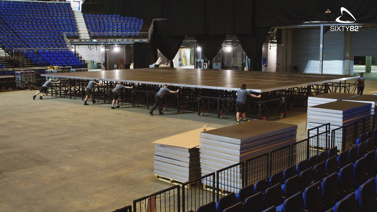 “The demanding but positive back-and-forth feedback from The O2 was great and extremely valuable in reaching the right solution”, says Rainier Smeding, Sales Director at Sixty82. The new system needed to deliver: improved deployment speed; full imperial dimensions, aligned with UK working standards; high rigidity and stability during use; reduced reliance on specialised crew; minimal loose components; an intuitive design; durable, long-life materials with minimal use of plastics; and the flexibility to build different stage sizes, including wings and thrusts.
