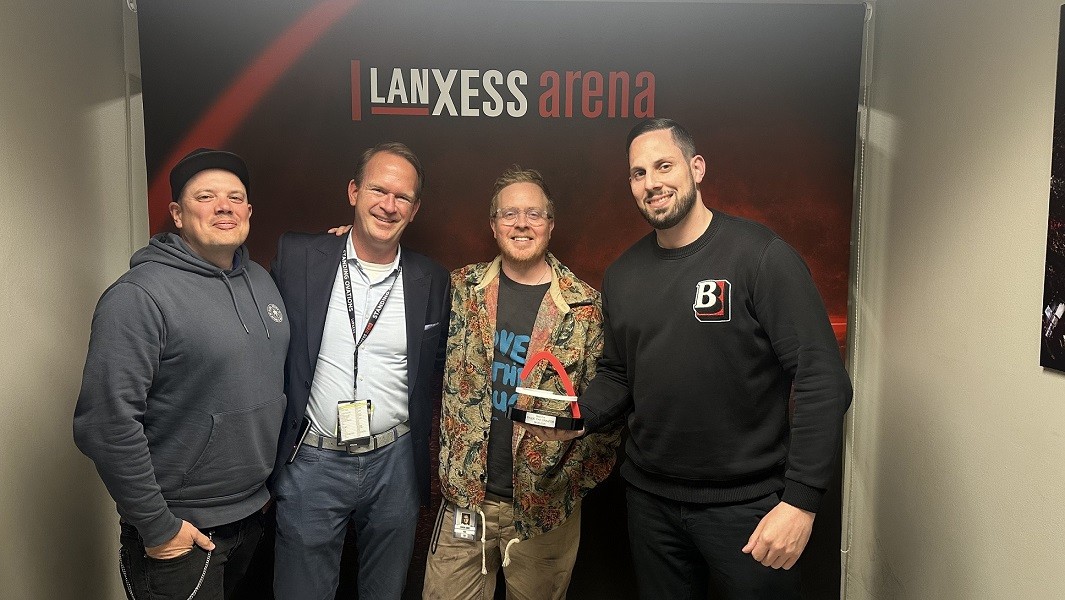 Foto (v.l.): Nico Hamm (Concert Team NRW), Stefan Löcher, Simon Jones (AEG), Ben Mitah (Karsten Jahnke). (Fotocredit: Arena Management GmbH)