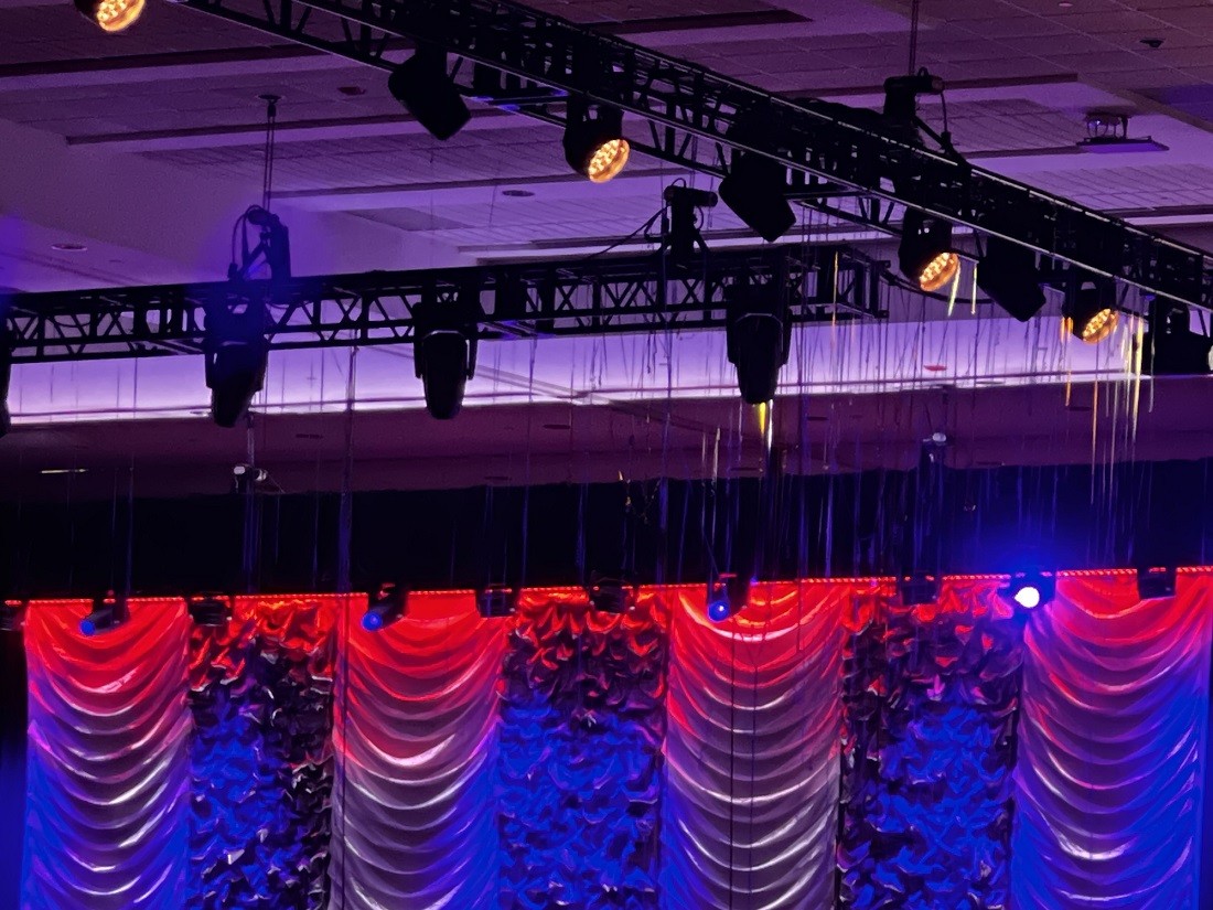 “This was not your standard corporate design with a stage wash and audience wash”, she explains. “We needed lighting to transition from a formal dinner to onstage presentations, to performances by bands, cheerleaders, and dance groups, to a late-night dance party. We needed those clean stage washes and audience lighting, but also pickups, accent lighting, and vibrant effects while supporting other elements like walkthroughs and videos.”