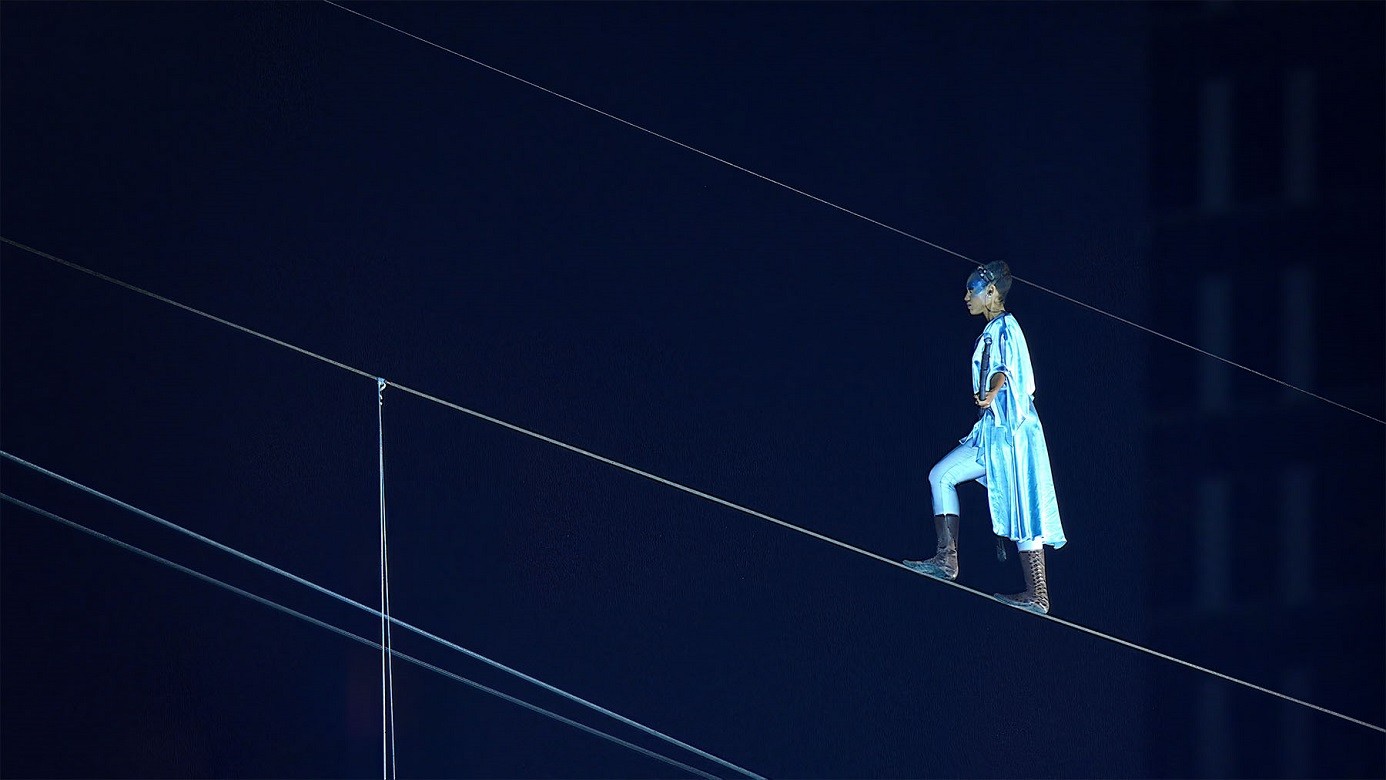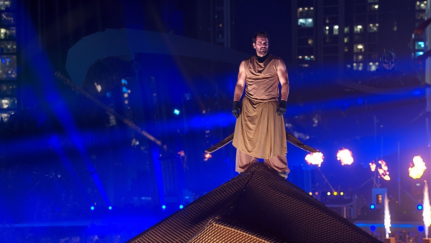 The main issue for Smith and Johnson’s lighting design was getting enough powerful key lighting rigged in the right places to register properly and illuminate the cast across this vast area, so the 36 broadcast cameras, directed by Marcus Viner, could get the best shots. Additionally, for the tightrope artist, twenty-four iForte LTXs were placed on the roof of the Dubai Mall to light the line. The only available positioning for tracking follow spots was on top of the souk market, around 150 metres away from the location of the wire.