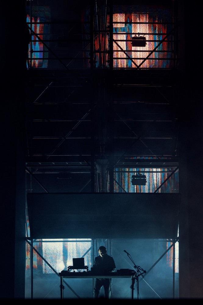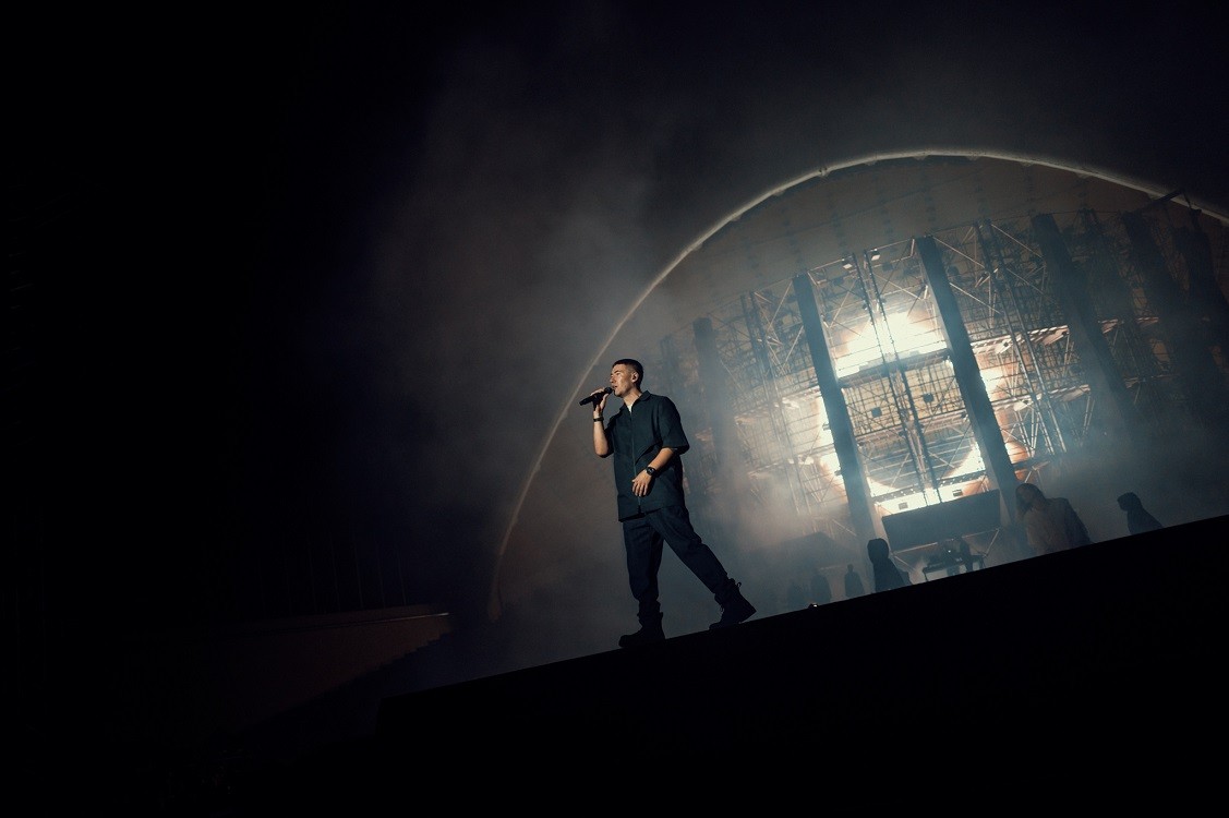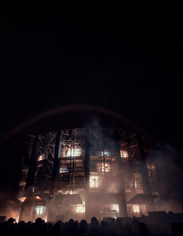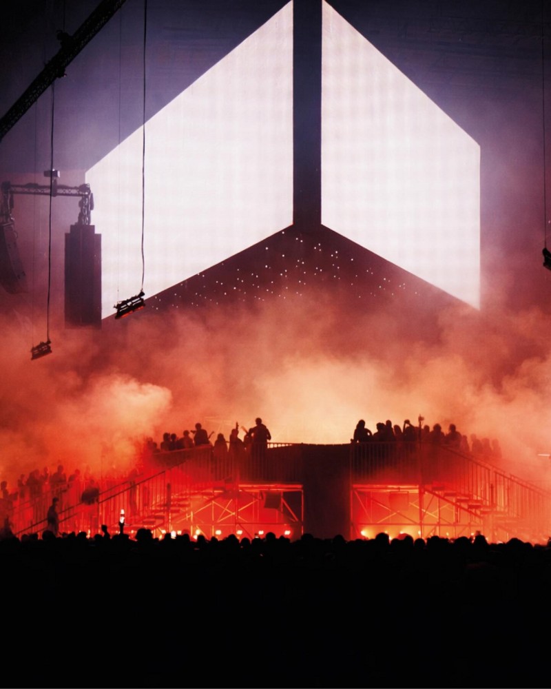 Enhancing the experience at the spacious venue was a visual production by Nick Jevons and Ross Chapple of Auratecture that flowed with the transcendent music and immersed the room with dynamic lighting displays. Describing the show with its 360 stage and asymmetrical design, Jevons refers to it as a combination of “brutalist asymmetry and Mayan-like scenography”.