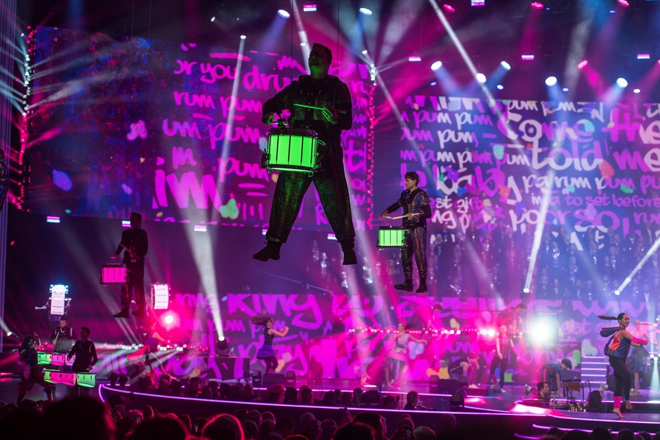 Providing colors for this vivid panorama were 28 Color Strike M motorized strobe-washes, 22 Colorado PXL Curve battens, twelve Rogue R2X Beams, and twelve Maverick Storm 3 BeamWashes. Adding extra punch to the design at key moments and delivering audience lighting were 24 Strike Array 2 fixtures, flown on the downstage truss.
